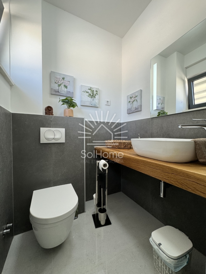 Predstavljamo vam iznimnu dvojnu vilu prvi red do mora, smještenu tik uz pješčanu plažu u mirnom novom naselju u Privlaci kraj Zadra. Vila očarava prekrasnim pogledom na more i pažljivo osmišljenim rasporedom prostora.
