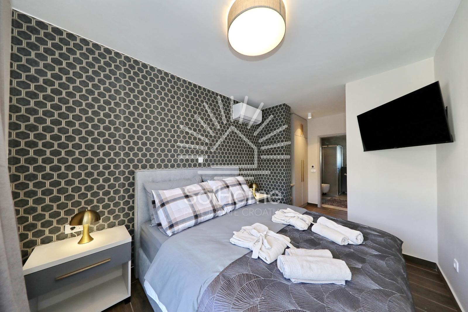 Unutarnje stepenice vode na kat gdje se nalaze tri prostrane spavaće sobe, svaka s vlastitom kupaonicom i izlazom na terasu s impresivnim pogledom na more.