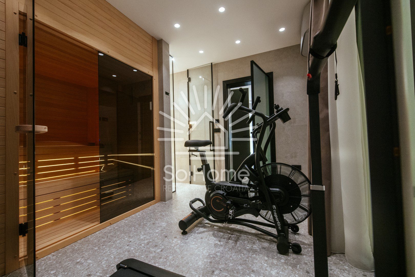 – Sauna: Sauna od abachi drva s tušem, trakom za trčanje i profesionalnim biciklom s otporom zraka